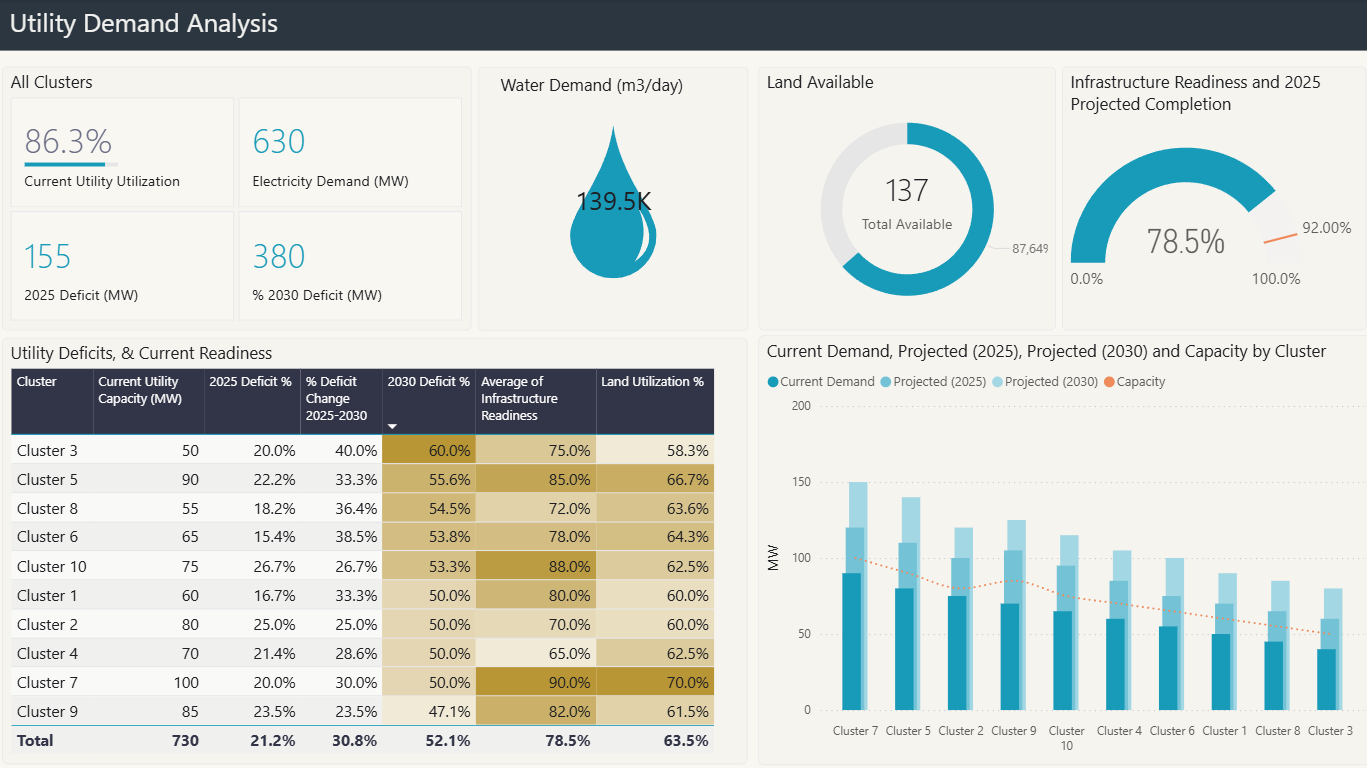 - Identify clusters where utility demand will surpass capacity by 2025/2030 and suggest strategies to mitigate the risk.